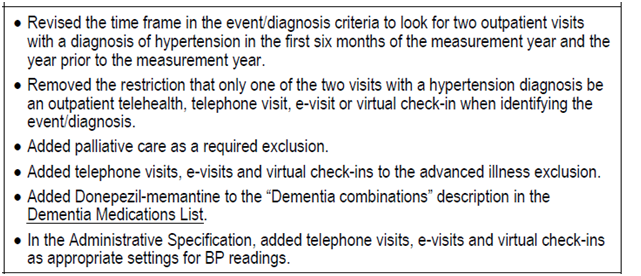 Changes that NCQA posted for HEDIS Measure-Controlling High Blood Pressure, 2020/2021