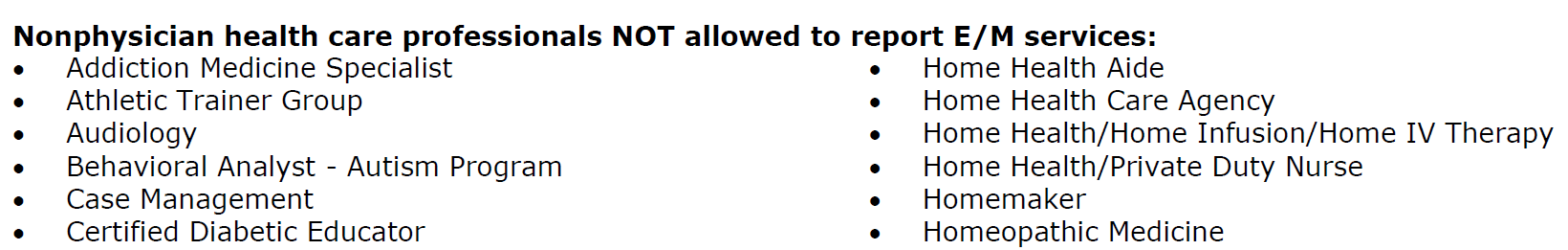 The policy expanded the Non-Physician Providers List that are not allowed to report E/M codes. Please see the partial list below:
